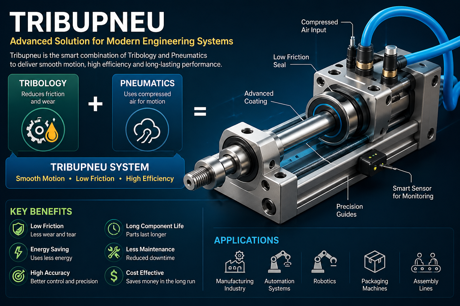 In reality, tribupneu includes systems that allow pneumatic motion to be enhanced with improved surface technology. This could include coated pistons, seals with low friction, and sensors that regulate the air pressure.